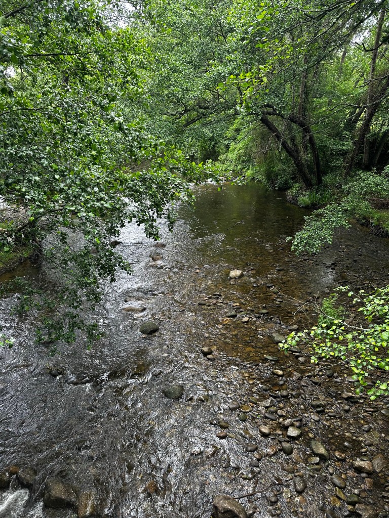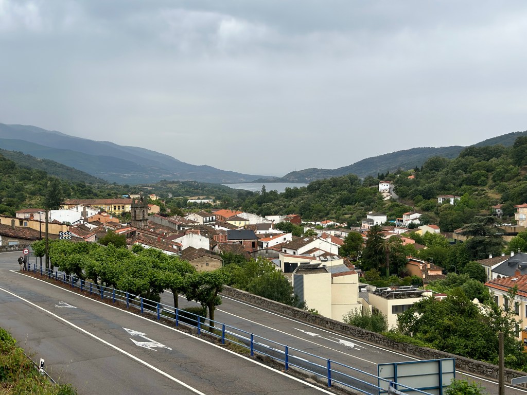 Après les 10 premiers kms, trempés, nous arrivons au petit café de Baños de Montemayor, dans lequel nous nous étions arrêtés en 2017 lors de notre périple en vélo. On profite d’un petit café con leche et nous voilà reparti de plus belle pour grimper et frôler les 900 m d’altitude en suivant la Calzada romana.