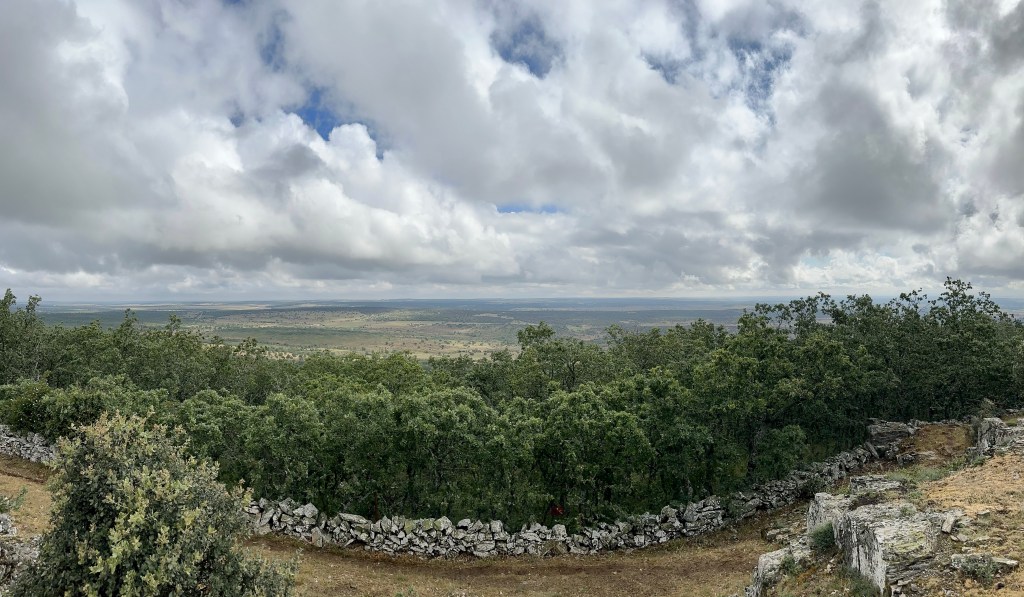 Très vite nous sentons le terrain se plisser pour commencer l’ascension du Pico de la Dueña. Au sommet, celui ci nous aura pris beaucoup d’énergie. L’effort en valait la peine car du haut de ses 1148 nous avons un splendide point de vue. C’est aussi le point median de la Via de la Plata entre Séville et Compostelle.