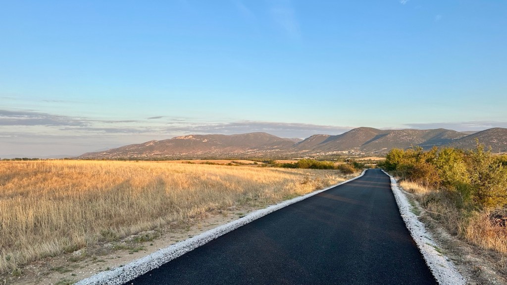 Pour commencer une petite route bien tranquille, au revêtement tout neuf nous permet d’apprécier le lever de soleil et les lumières du matin. On sera tranquille pendant 5 kms le temps d’atteindre la route principale à Neos Xerias. Arrivés au village, deux cafés s’offrent à nous. Dans l’un d’entre eux, un homme me fait signe de venir. Voilà comment choisir! Une série de questions habituelles mais toujours très sympathiques. Au final on nous offrira des figues fraîches.