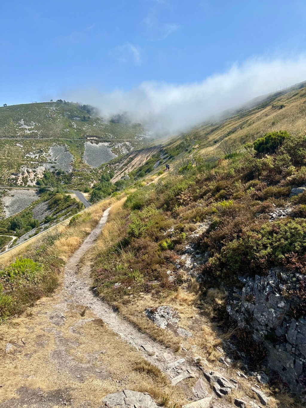 Une fois sur le chemin de crête, ça monte toujours, plongés dans la brume les pèlerins paraissent des fantômes.